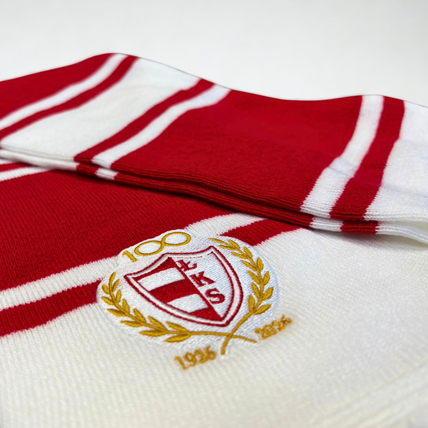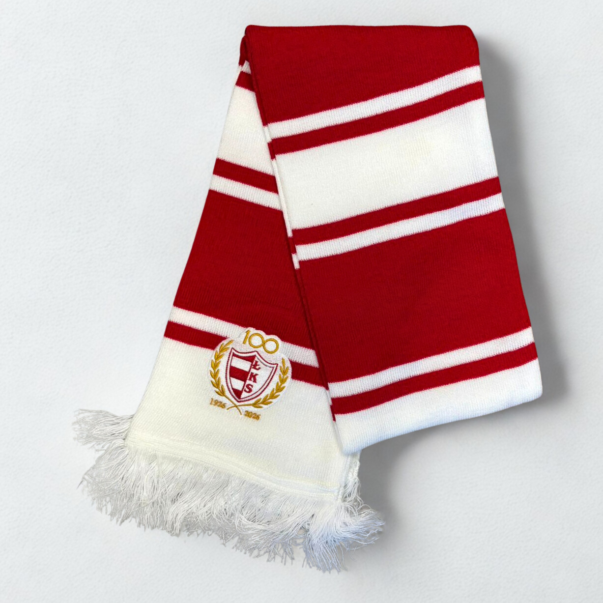 Dziany szalik biało czerwony „pasiak” z dwoma haftowanymi w wysokiej jakości herbami na 100 lecie Łomżyńskiego Klubu Sportowego